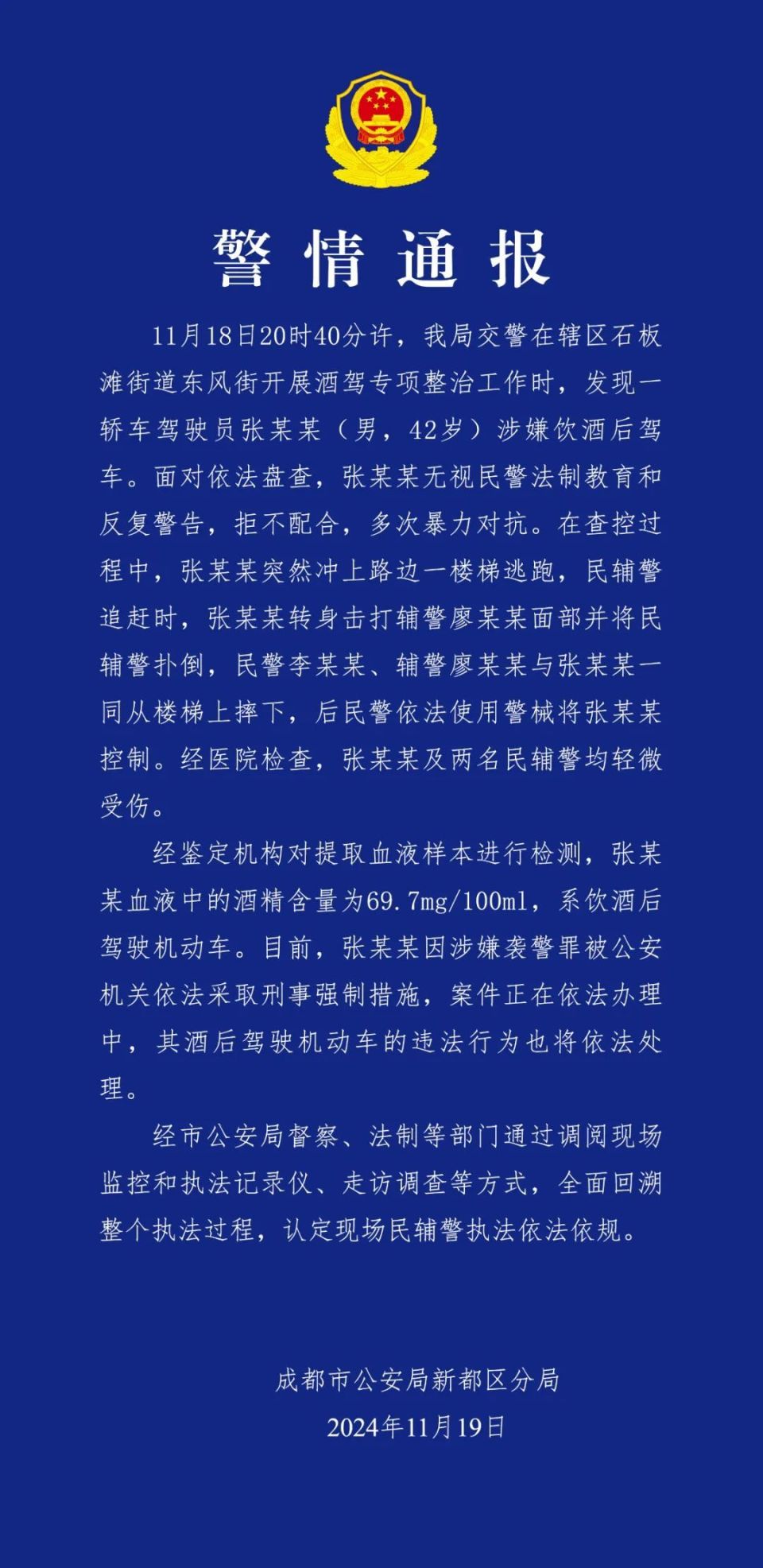 11月18日20时40分许,成都市公安局新都区分局交警在辖区石板滩街道东风街开展酒驾专项整治工作时,发现一轿车驾驶员张某某(男,42岁)涉嫌饮酒后驾车。面对依法盘查,张某某无视民警法制教育和反复警告,拒不配合,多次暴力对抗。在查控过程中,张某某突然冲上路边一楼梯逃跑,民辅警追赶时,张某某转身击打辅警廖某某面部并将民辅警扑倒,民警李某某、辅警廖某某与张某某一同从楼梯上摔下,后民警依法使用警械将张某某控制。经医院检查,张某某及两名民辅警均轻微受伤。