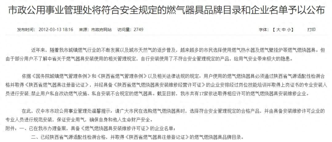 记者在汉中市人民政府官网搜索发现,2012年,汉中市公用事业管理处公布符合安全规定的燃气器具品牌目录和企业名单,该市有17家依法取得相应许可的燃气燃烧器具安装维修企业。该文内还说明:“依据《国务院城镇燃气管理条例》和《陕西省燃气管理条例》以及相关法律法规的规定:用户使用的燃气燃烧器具必须通过陕西省气源适配性检测合格并取得《陕西省燃气器具注册登记证》,并经具备《陕西省燃气燃烧器具安装维修经营许可证》的企业安排经过岗位技能培训并取得上岗证书的专业安装人员进行安装。”