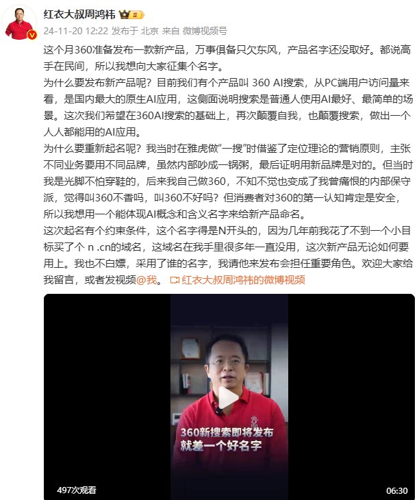 11月20日,周鸿祎发布微博称:这个月360准备发布一款新产品。 为什么要发布新产品呢?目前我们有个产品叫 360 AI搜索,从PC端用户访问量来看,是国内最大的原生AI应用,这侧面说明搜索是普通人使用AI最好、最简单的场景。这次我们希望在360AI搜索的基础上,再次颠覆自我,也颠覆搜索,做出一个人人都能用的AI应用。
