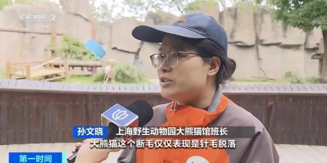 上海野生动物园大熊猫馆班长 孙文晓:大熊猫的断毛仅仅表现针毛脱落,但是它的绒毛其实还是非常丰密的,并不是它断毛后皮肤就会裸露在外面。经过时间的变化,大熊猫断毛的针毛都会逐渐长出来的。