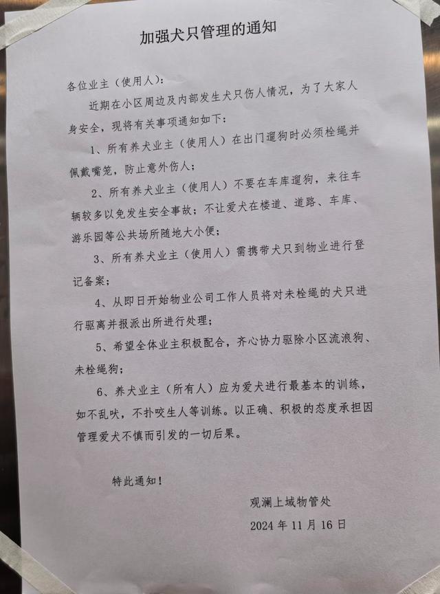 ▲女童被狗咬后,物业张贴的加强犬只管理的通知