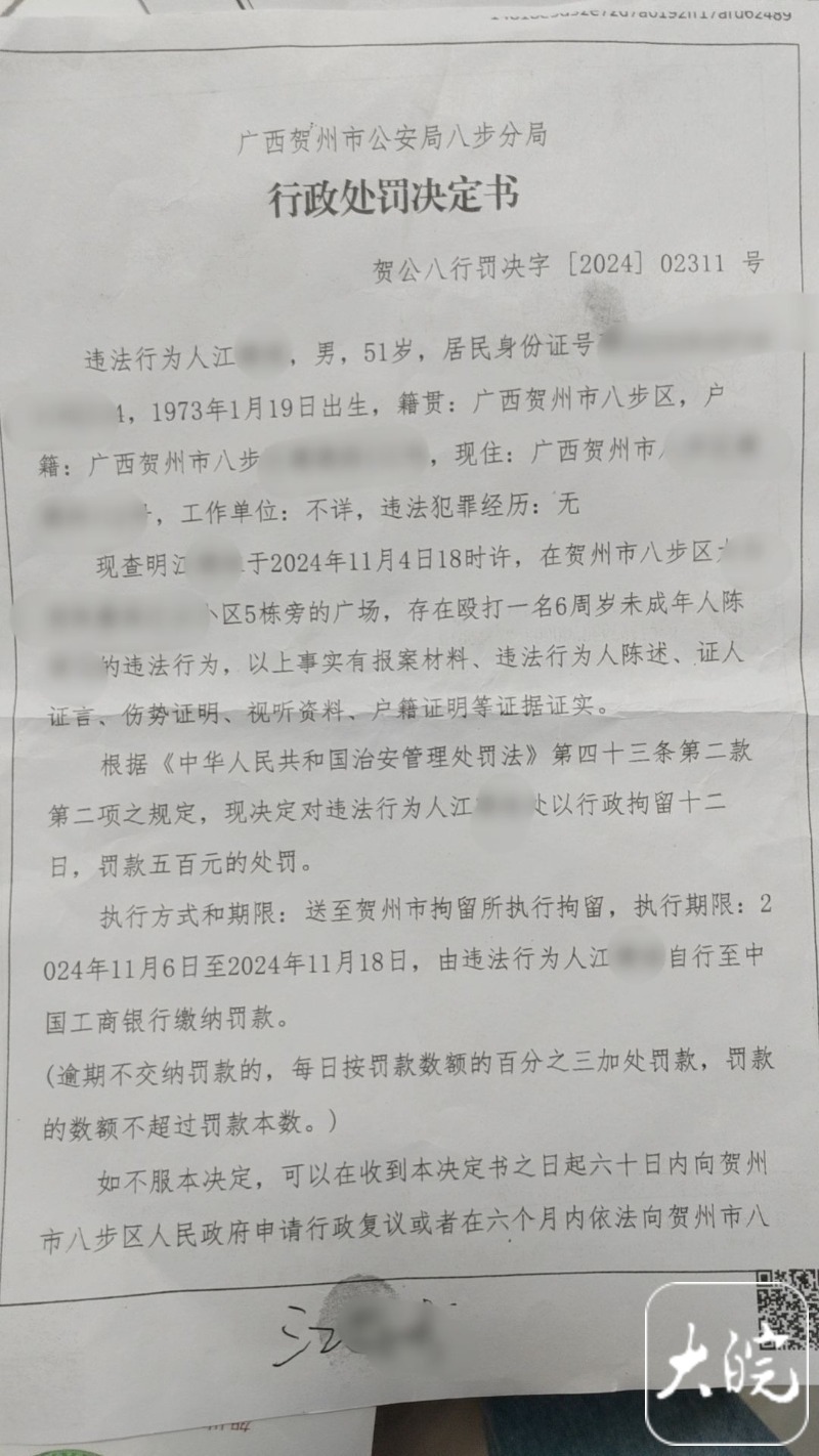 另一份由广西贺州市公安局八步分局出具的《行政处罚决定书》则显示,违法行为人江某,男,51岁。于2024年11月4日18时许,在贺州市八步区某小区5栋旁的广场,存在殴打一名6周岁未成年人陈某的违法行为,以上事实有报案材料、违法行为人陈述、证人证言、伤势证明、视听资料、户籍证明等证据证实。