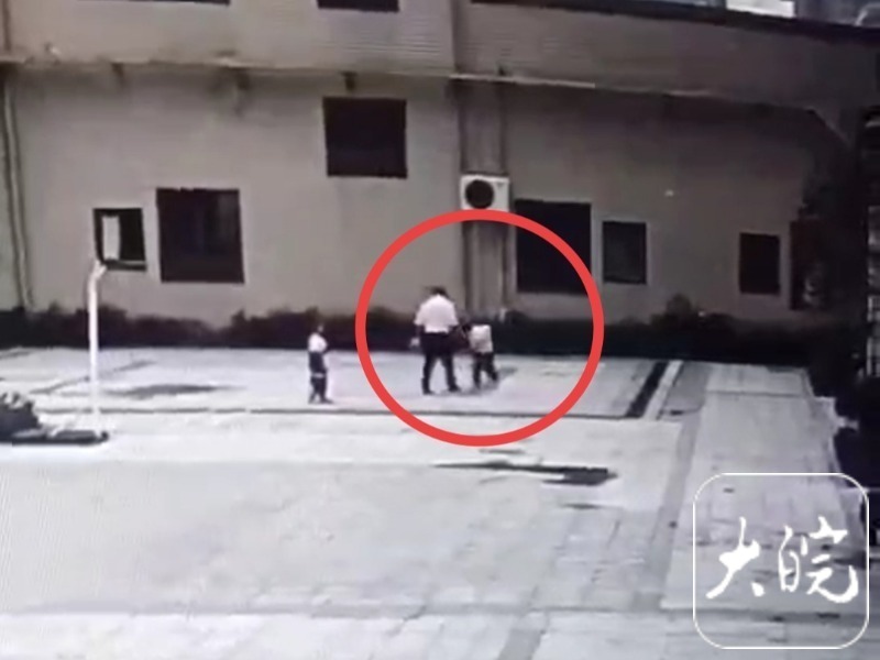 现场监控视频画面显示,事情发生在当日18时许,两名男童在楼下广场追赶,然后一名白衣男子赶来,见此情况疾步上前,用手击打其中一名男童的面部,男童后退至角落里,该男子继续上前用手击打男童面部,随后带着另一名男童离去。