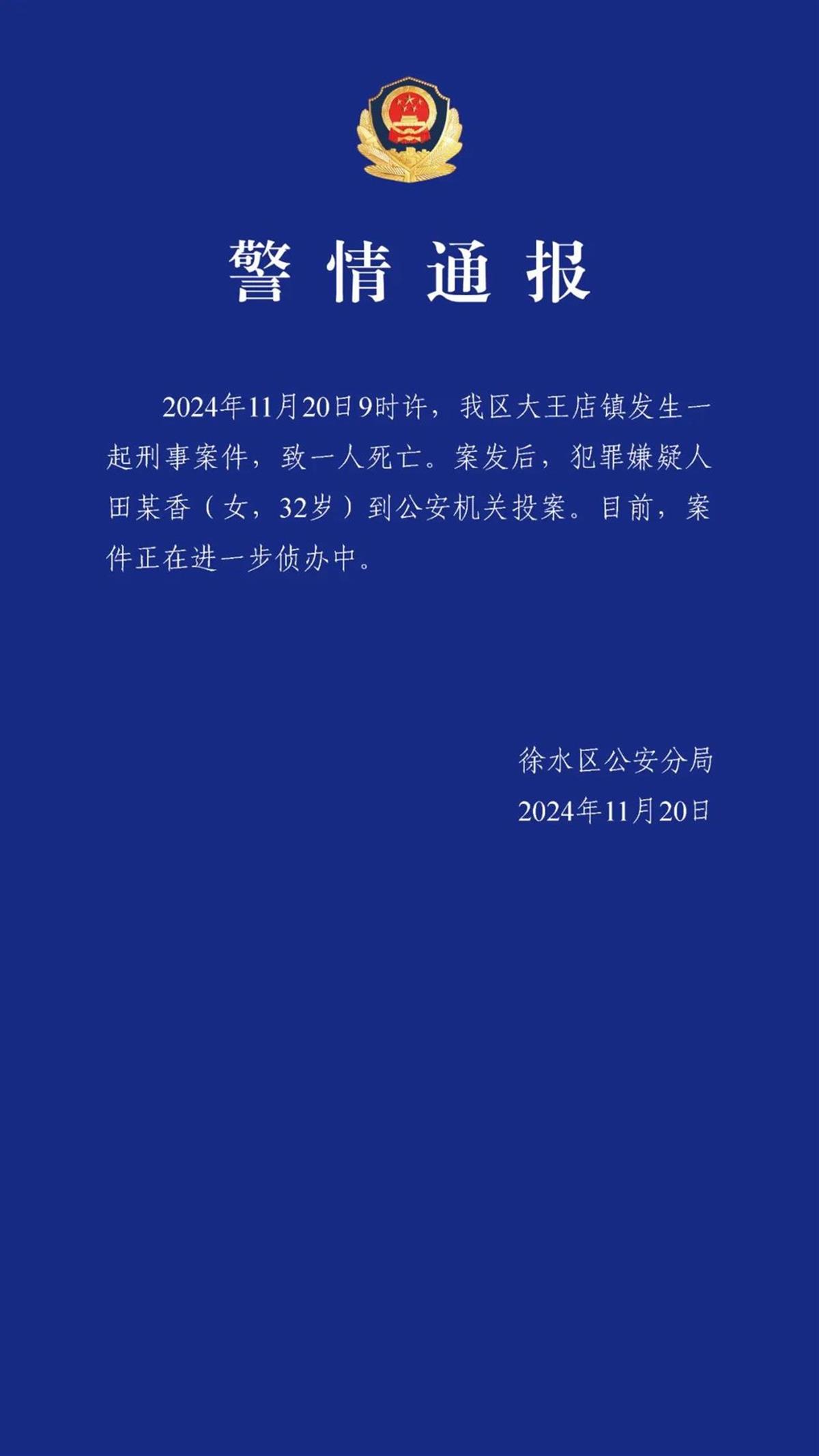 11月20日傍晚5点33分,保定市徐水区公安分局发布通报称,11月20日9时许,该区大王店镇发生一起刑事案件,致一人死亡。案发后,犯罪嫌疑人田某香(女,32岁)到公安机关投案。目前,案件正在进一步侦办中。