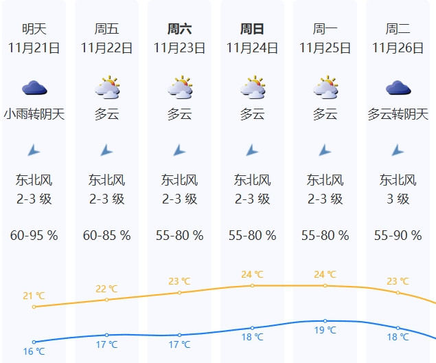 21日小雨转阴天,下午天色渐转明朗,气温16-21℃;