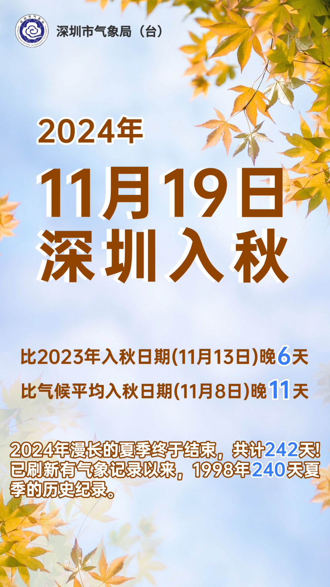 根据历史气象数据显示,深圳今年入秋较常年(1991年-2020年)平均入秋时间(11月8日)晚了11天,且近几年深圳入秋都相对晚些,尤其是2020年11月27日才成功入秋。