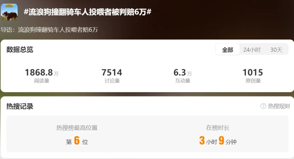 11月20日下午,#流浪狗撞翻骑车人投喂者被判赔6万#话题登上热搜。