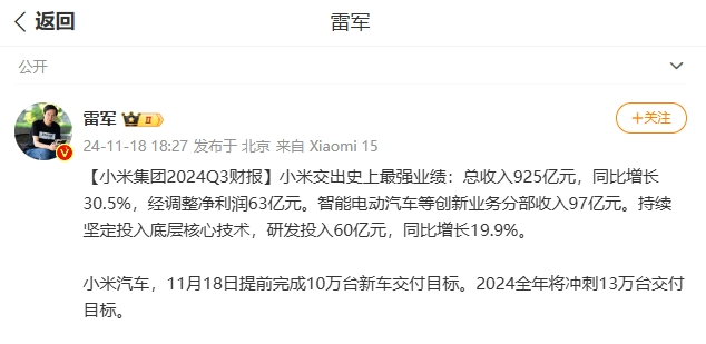 11月18日晚间,小米集团发布的2024年第三季度财报显示,公司第三季度总收入突破925亿元,较上年同期的708.9亿元增长30.5%;经调整净利润为63亿元,同比增长4.4%,其中包括智能电动汽车等创新业务经调整净亏损15亿元,环比收窄约16.6%。