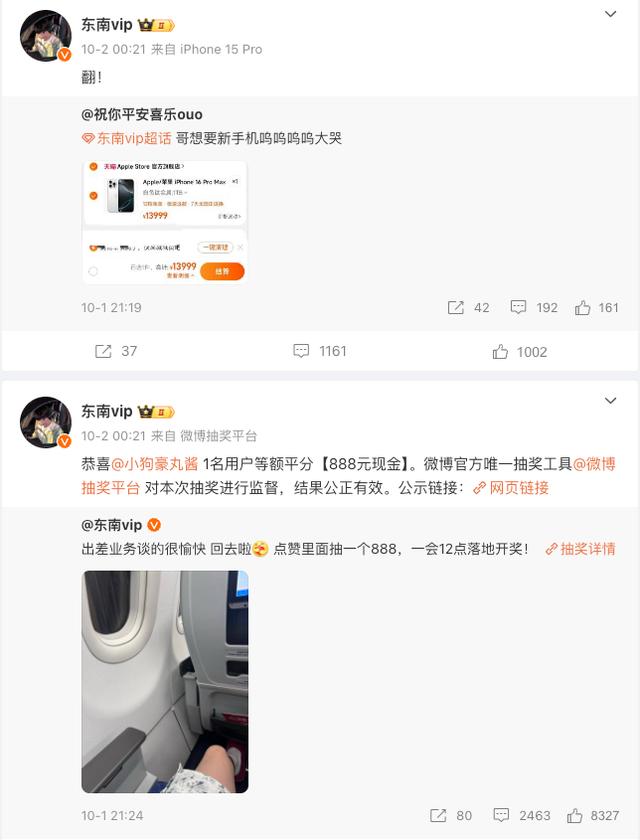 另一方面,东南仍在社交账号上展现出“不差钱”的样子。他接连现身粉丝见面会、奢牌新展,并持续抽奖开奖。因此苗苗觉得,“一个百万粉丝博主不会欠我这么点钱,况且群里还有投了50万甚至更多的呢。”