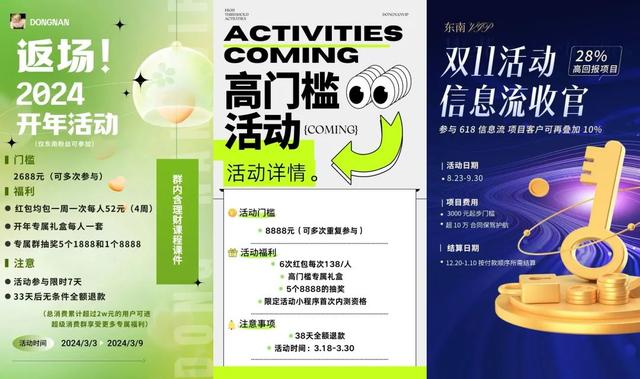 记者了解到,东南从去年十月开始推出此类活动。最开始的活动还包含部分网课、营销教学,后期逐渐转型为以红包、高额利息回报为主的项目。宣传海报显示,一则起投金额为3000元、周期四个月的“信息流项目”,收益率在28%左右;如果参加过之前的,该项目回报最高可以达到38%。