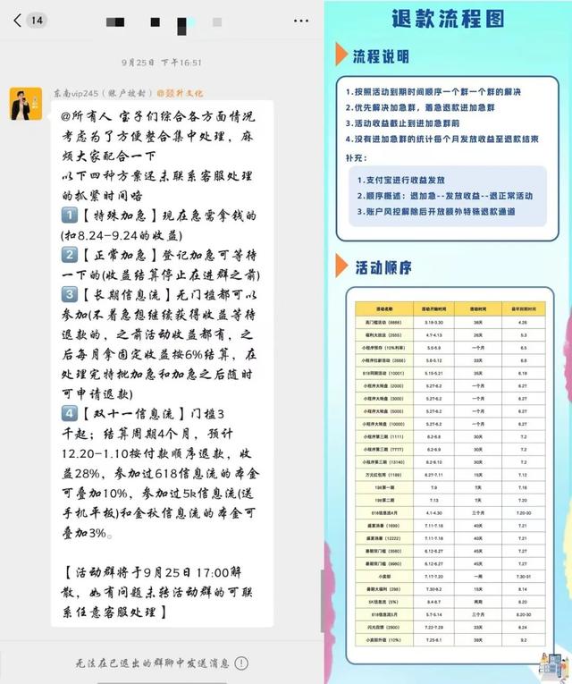 东南坦言,退款困难属实。因为要保证账面上有流动资金正常做业务,所以退得不会那么快,确实存在有人退款延迟。比如三四月份的活动流水巨大,到目前为止大概还有200人左右没退完。到八九月份,因为外界的舆论攻击、大号被封,大量商业合作受到影响,导致公司资金周转困难。“流动资金崩掉,后面就真成了难题。”