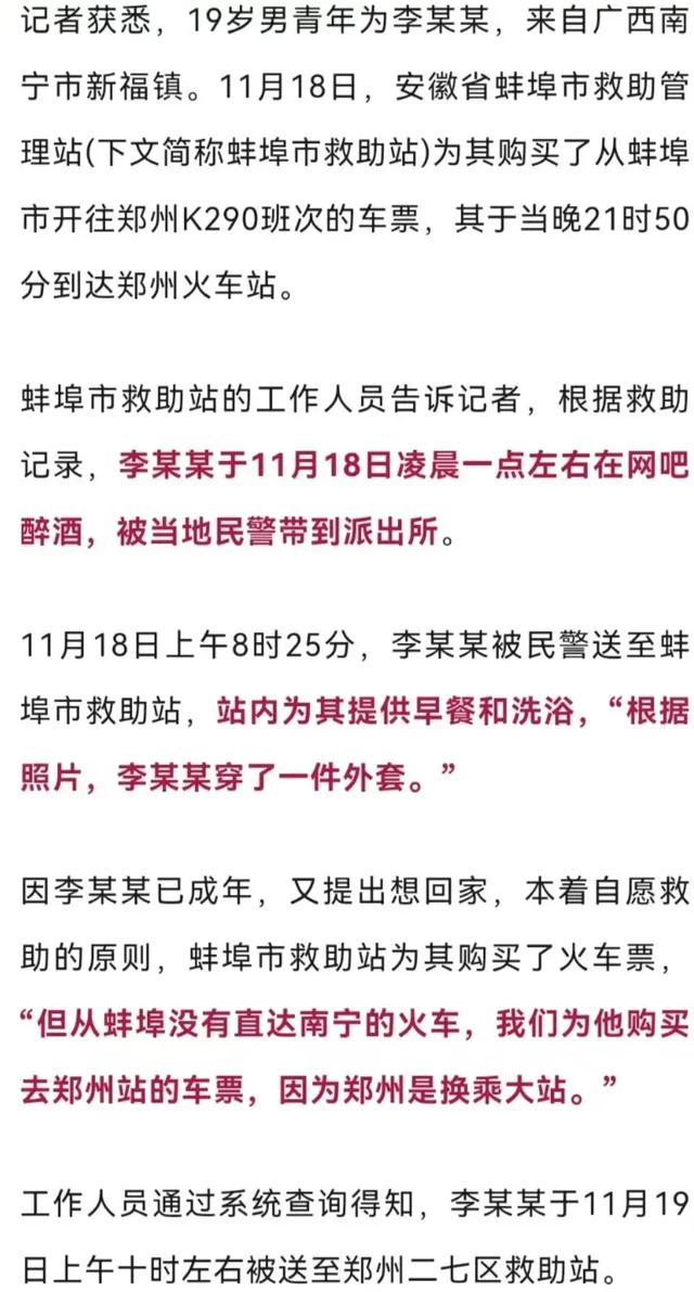 郑州相关职能部门工作人员告诉记者,网传信息与实情不符,该19岁青年于11月18日晚乘火车由蚌埠抵达郑州,19日下午搭乘火车离开郑州,“并非网传4天未吃喝。”