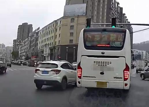 随后,大巴车加速驶过路口时,再次向左变道,不慎剐蹭一辆白色SUV。大巴车没有停车,而白色SUV紧追不舍,试图让大巴车停下。