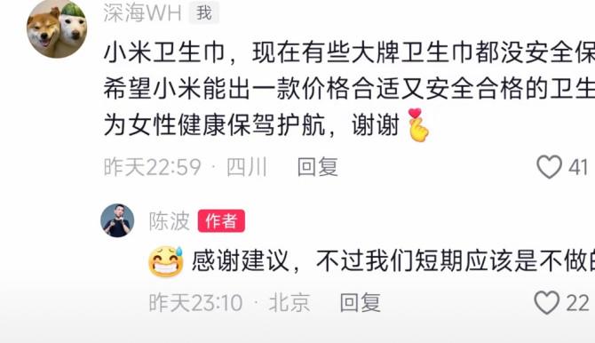 虽然雷军没有直接回复后续是否推出小米卫生巾,但有网友评论区留言“小米卫生巾,现在很多卫生巾品牌没有安全保障,希望小米设计一款价格合适又安全的卫生巾为女性健康保驾护航”,小米公司生态链部总经理陈波回复“感谢建议,不过我们短期应该不做”,引得网友猜测可能小米内部正在长期布局。