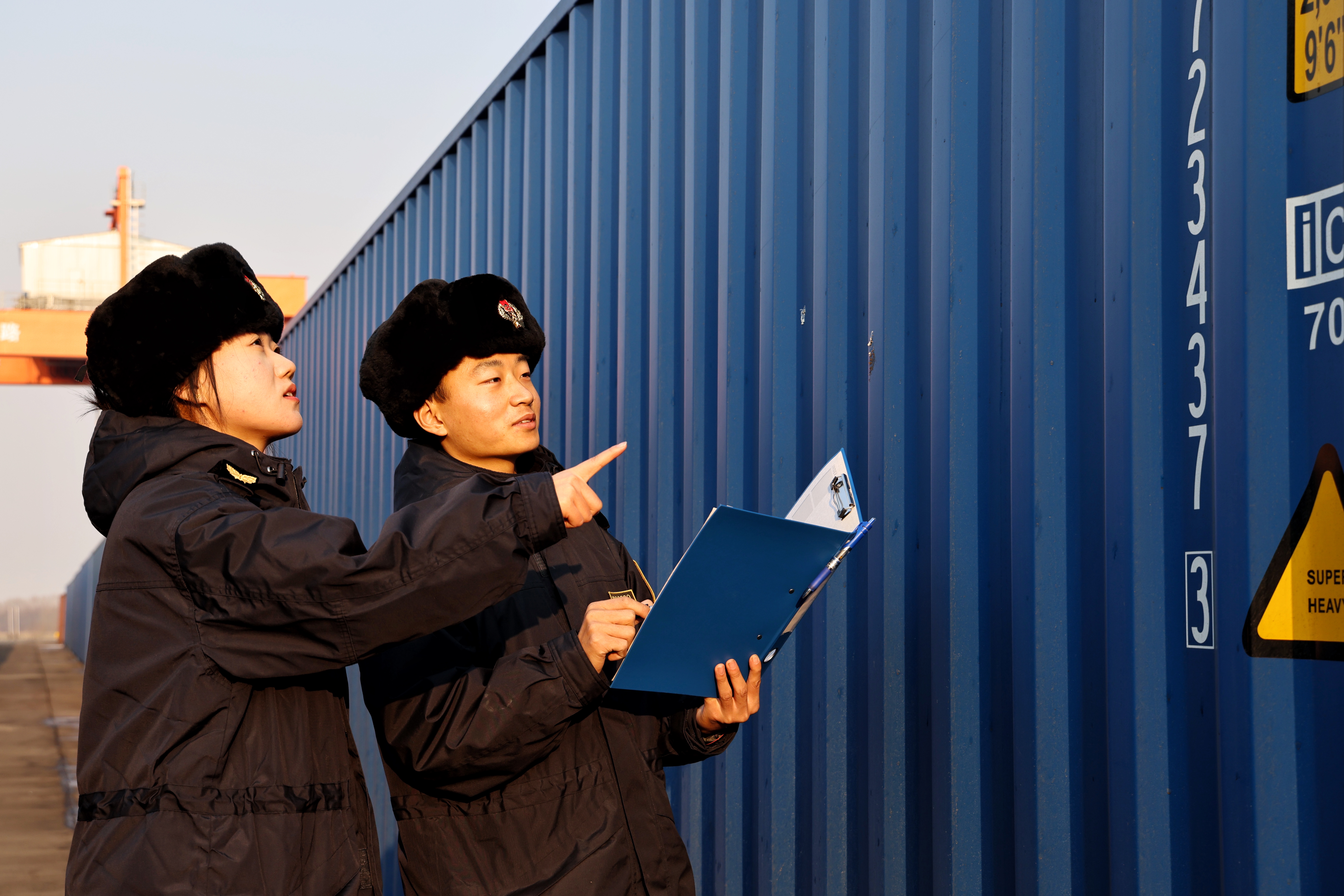 同江海关关员正在核对中欧班列集装箱信息(受访者供图)