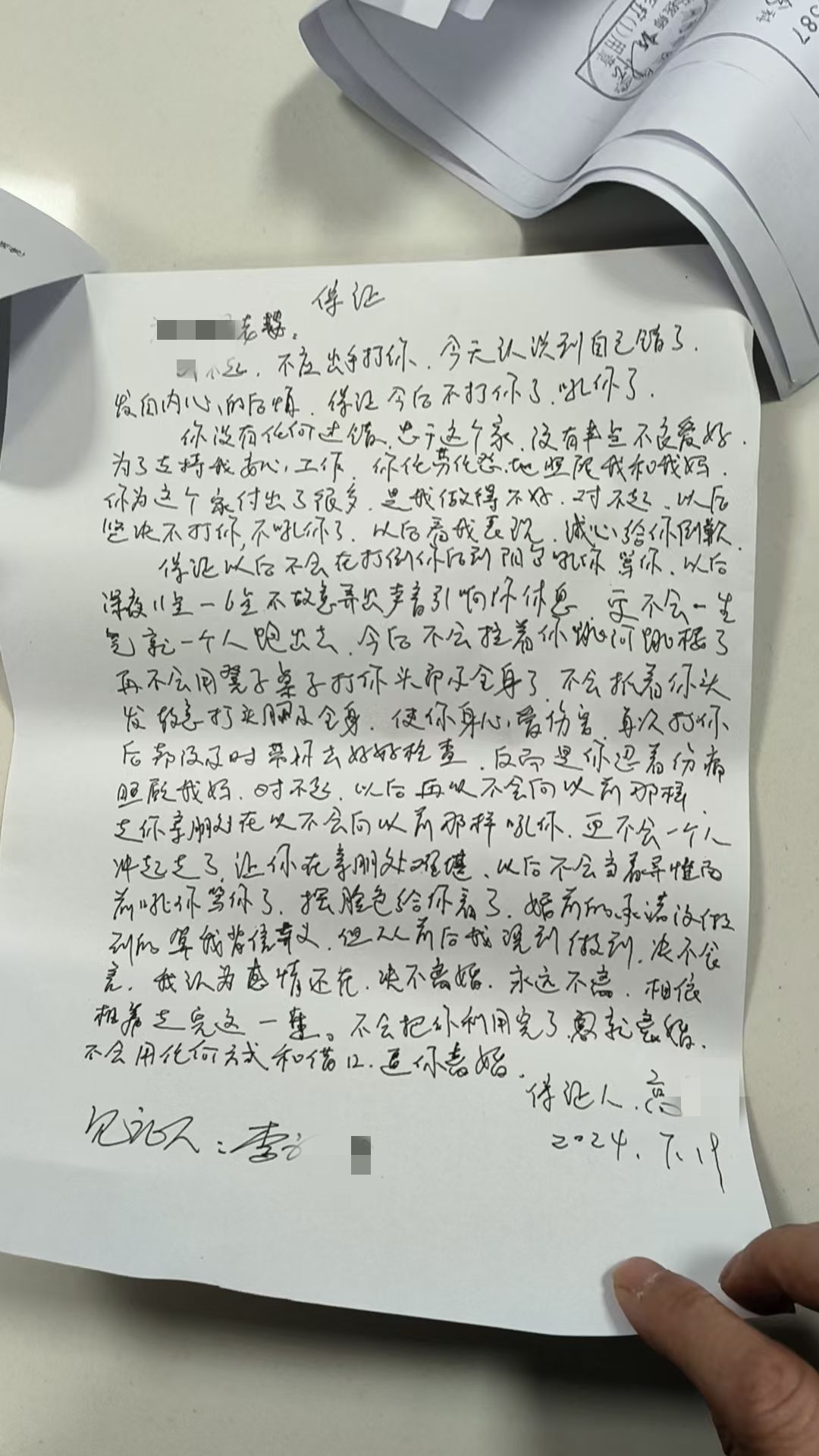 2024年7月的一份保证书中再次写道:“对不起,不应出手打你,今天认识到自己错了,发自内心地后悔,保证今后不打你了、吼你了。你没有任何过错,忠于这个家……”并署有见证人李某的名字。张丽称,该见证人即是泸州市看守所主要负责人。