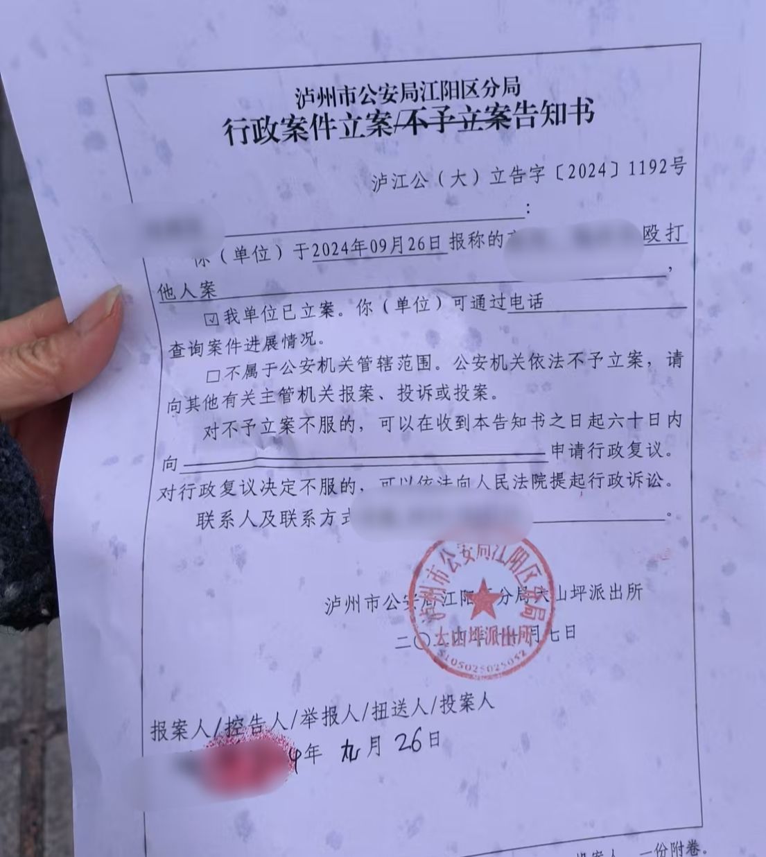 属地泸州市公安局江阳区分局大山坪派出所出具的《行政案件立案告知书》显示,今年9月26日,张丽报警后,该单位曾立案。