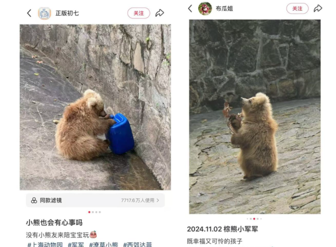 因为毛发旺盛,形态灵动活泼,长相别具一格,军军被游客亲切的称呼为"潦草小熊"。又因为潦草的毛发,被网友戏称像"没洗澡的萨摩"。