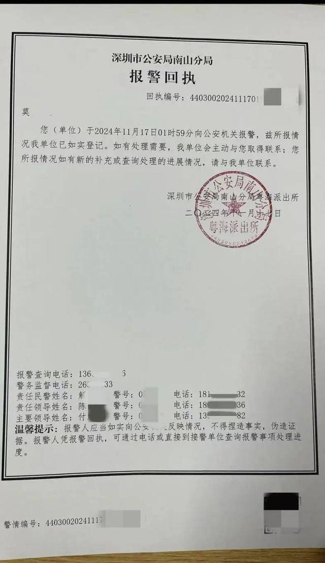 莫先生说,当日事发后,他第一时间联系了酒店,希望酒店相关负责人出面解决,但是前台以经理住得太远无法赶来为由拒绝。半小时之后,莫先生选择报警。莫先生给记者提供的报警回执显示,莫先生于2024年11月17日01时59分向公安机关报警。