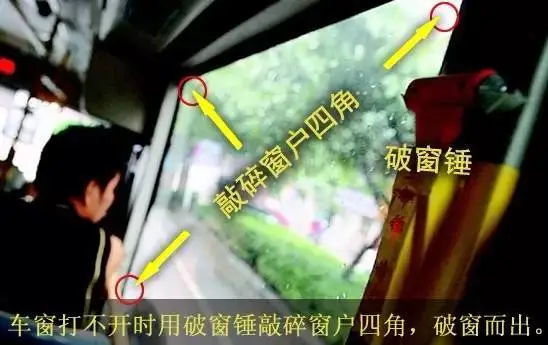 3、远离车门的人员,应用安全锤敲击车窗玻璃四角,迅速从车窗逃生;