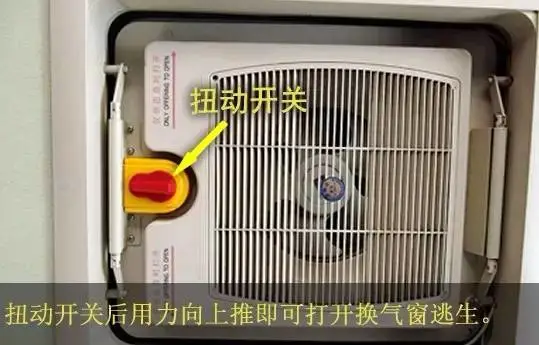4、车顶天窗逃生:车顶天窗上有一个红色开关,扭动之后用力向上推,即可打开天窗逃生。