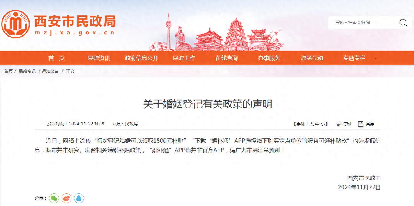11月22日,西安市民政局发布关于婚姻登记有关政策的声明,内容如下: