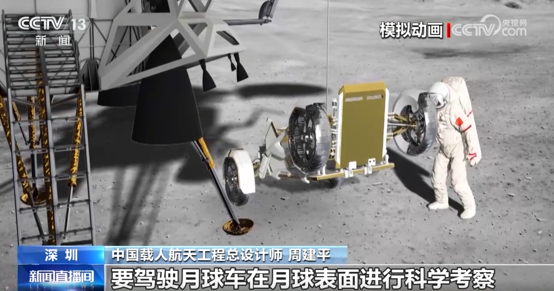 周建平称:“航天员要从着陆器出舱,要驾驶月球车到月球表面进行科学考察,而月球是一个六分之一的重力,这对我们航天员来说、对我们航天员的装备来说都有新的挑战。”