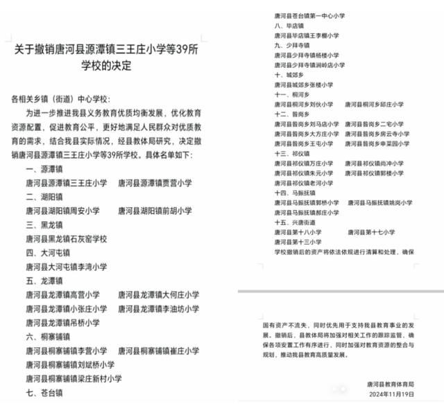 近日,河南省唐河县教育体育局发布《关于撤销唐河县源潭镇三王庄小学等39所学校的决定》。文件称,此举旨在进一步推进义务教育优质均衡发展,优化教育资源配置,促进教育公平,以更好地满足人民群众对优质教育的需求。