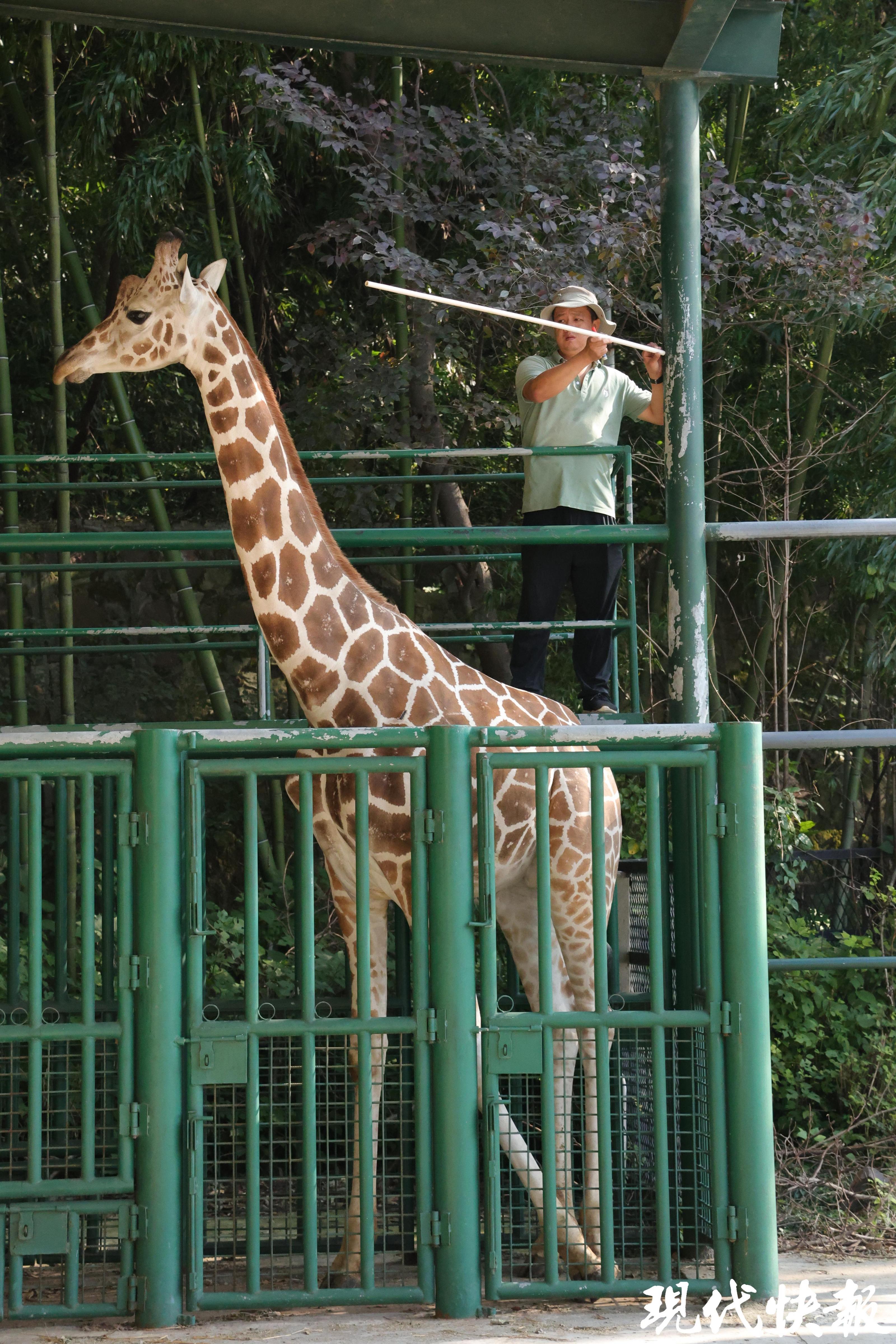 身高和体重,对于了解动物的营养状况至关重要。对高个子长颈鹿“九儿”“姗六”,保育员用美食将长颈鹿引至专属脱敏笼中,量得“九儿”身高3.8米,地磅称重是687公斤,“姗六”身高3.6米,称重541公斤。两只都算亚成年,属长身体时期,每年长个二十几公分、增重八九十公斤都是正常现象。