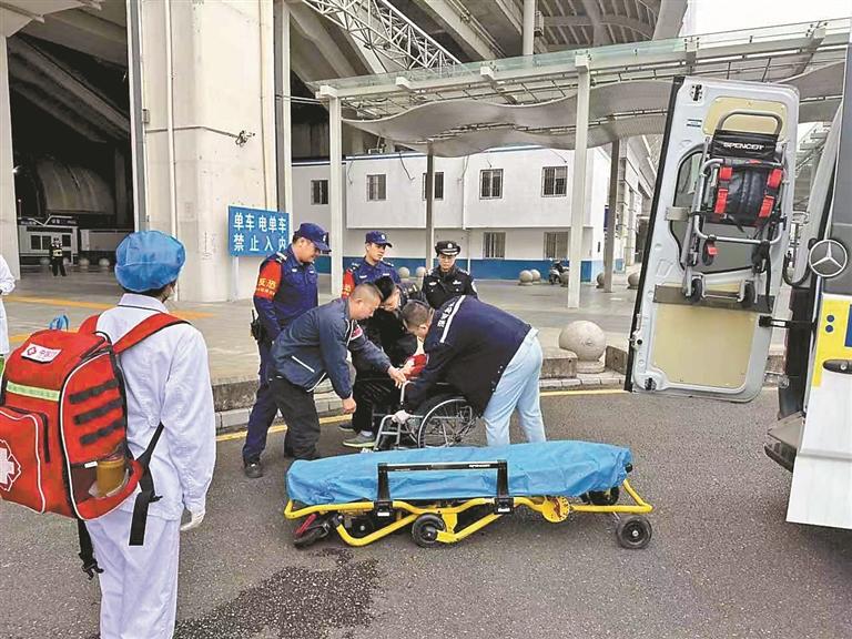 当时,坪山站派出所民警正在巡逻,忽然接到求助说有位高龄老人身体不适,倒在了站内通道上。民警接报后立即赶往现场,只见老人脸色苍白、四肢瘫软、无法站立,与其同行的家属也十分着急。民警第一时间拨打了120急救电话,随后通知车站工作人员推来轮椅,小心翼翼将老人转移到轮椅上。期间,民警不忘安抚家属情绪,并询问了老人的既往病史。