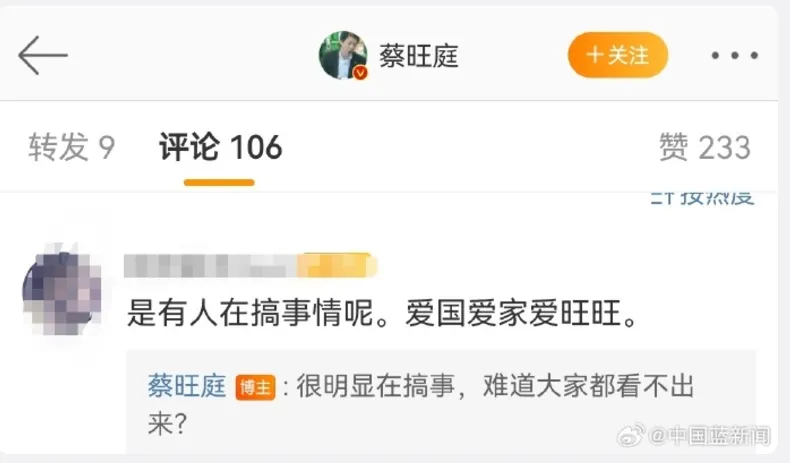 11月22日晚,旺旺三公子蔡旺庭回复粉丝留言称“明显有人在搞事,难道大家看不出来?”