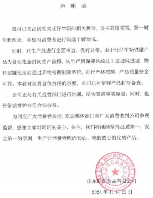 同时,对生产线进行全面审查,没有异常。由于旺仔牛奶铁罐产品为自动化全封闭生产流程,从生产到灌装共经过3道滤网过滤,物料空罐使用前通过异物检测剔除系统,进行严格控制,产品质量安全可靠。本着对消费者负责任的态度,公司已对留样产品封存备查。