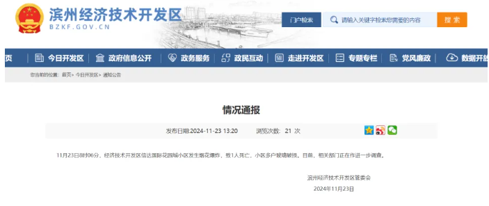 11月23日,山东滨州经济技术开发区管委会就该区信达国际花园城小区发生烟花爆炸一事发布通报。通报称: