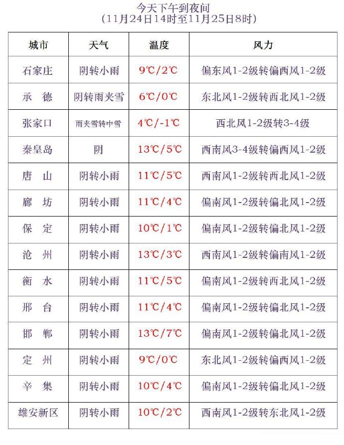 今天下午到夜间,全省多云转阴,张家口、承德和保定、石家庄、邢台、邯郸四个地区的西部有小到中雪或雨夹雪,其中张家口、承德、保定西北部局地有中到大雪,其他地区有小雨。最高气温,张家口、承德、保定西北部5~9℃,其他地区10~13℃。最低气温,张家口、承德、保定西北部-12~-1℃,其他地区0~7℃。