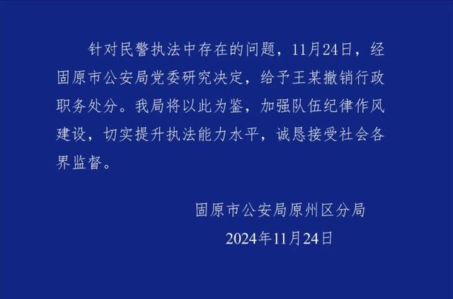 针对民警执法中存在的问题,11月24日,经固原市公安局党委研究决定,给予王某撤销行政职务处分。我局将以此为鉴,加强队伍纪律作风建设,切实提升执法能力水平,诚恳接受社会各界监督。