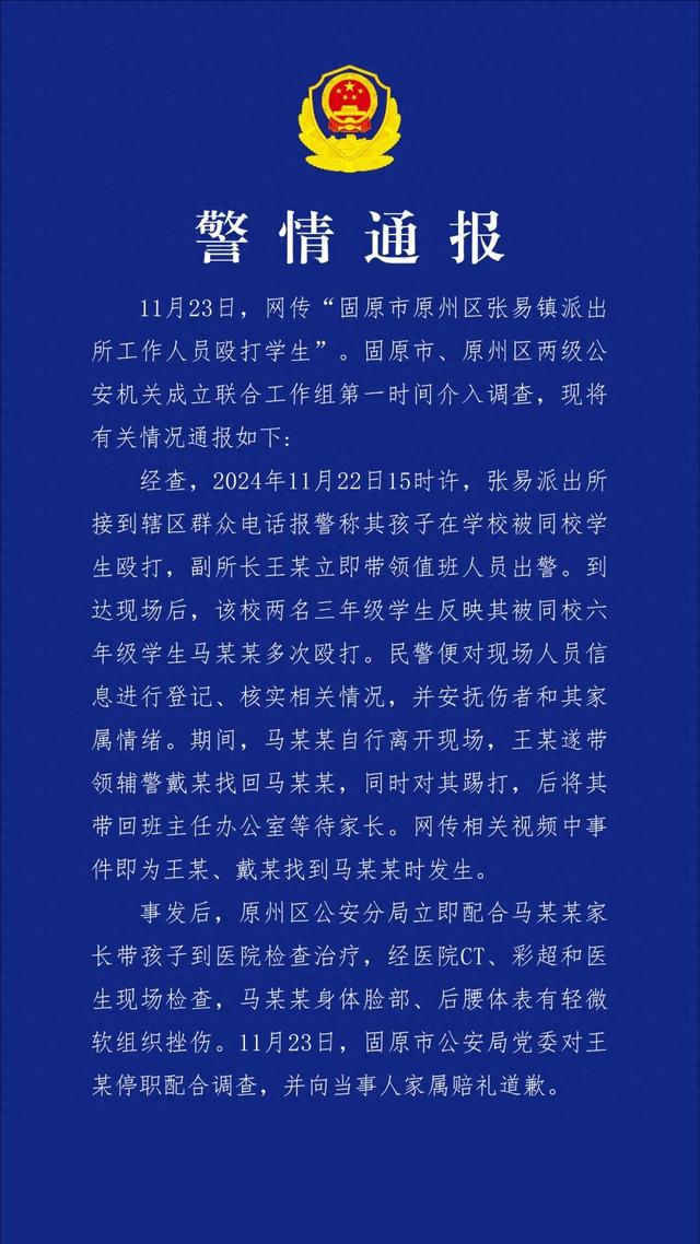 11月24日,固原市公安局原州区分局发布《警情通报》。通报称:11月23日,网传“固原市原州区张易镇派出所工作人员殴打学生”。固原市、原州区两级公安机关成立联合工作组第一时间介入调查,现将有关情况通报如下: