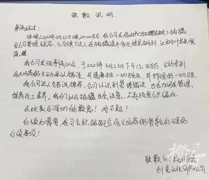 2023年3月23日下午,该网红团队所在公司杭州音速创意文化有限公司给信义坊商街管委会发来一封手写致歉信。其在信中向网友表示,“愿承担一切损失,并打理好一切卫生。公司认识到管理错误,也会加强管理,提高员工素养,以后拍摄也会注意,不再损害公共绿化。”