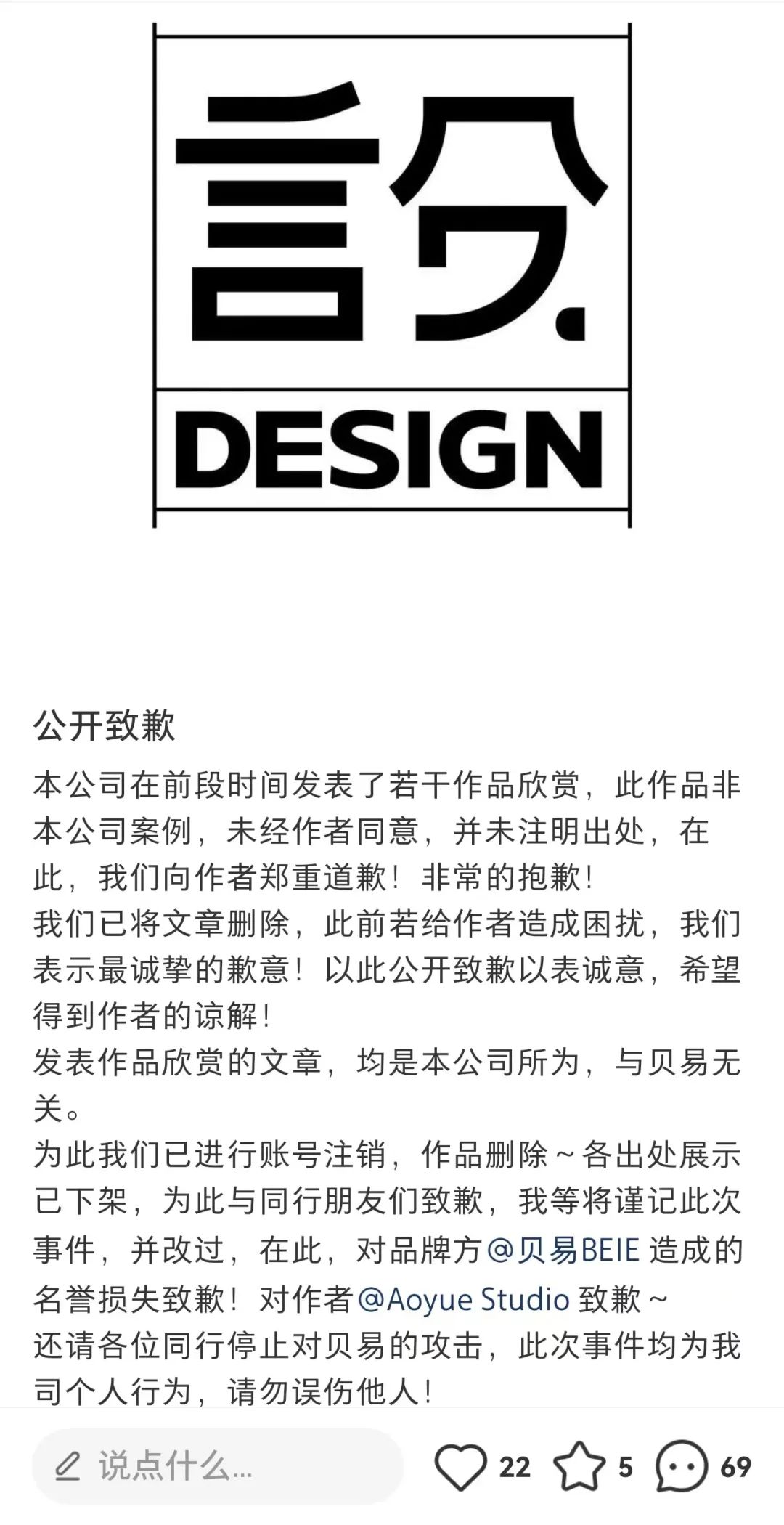 周涛表示,他已经意识到错误,已将擅自挪用作品删除,并发表一则公开致歉声明。