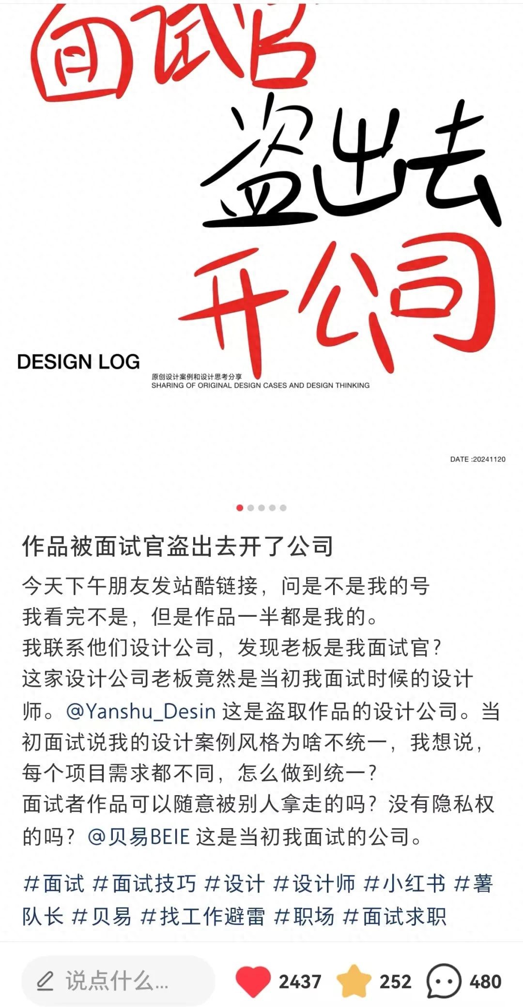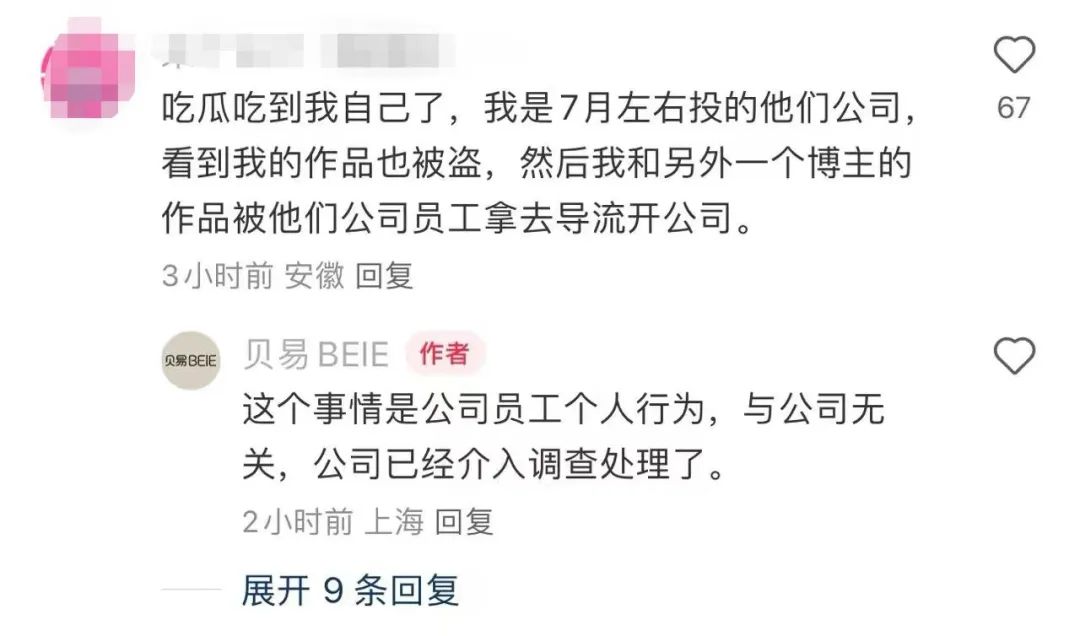 王越发帖后,另有曾在上海贝易面试过的设计师,也发现自己原创作品被周涛冒用“剽窃”。