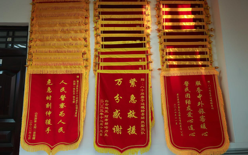 八十间房子边境检查站为群众服务,获得多面锦旗。图源:伊犁边境管理支队