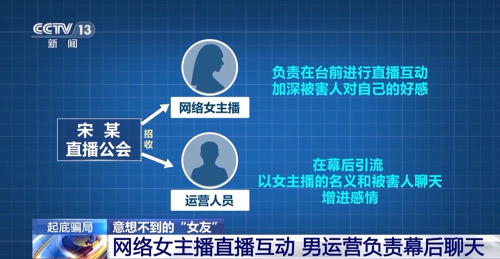 检察官介绍,宋某的直播公会主要招收两部分人员,一是网络女主播,二是运营人员。网络女主播负责在台前进行直播互动,加深被害人对自己的好感,运营人员则是在幕后引流,并且以女主播的名义和被害人聊天,增进感情。