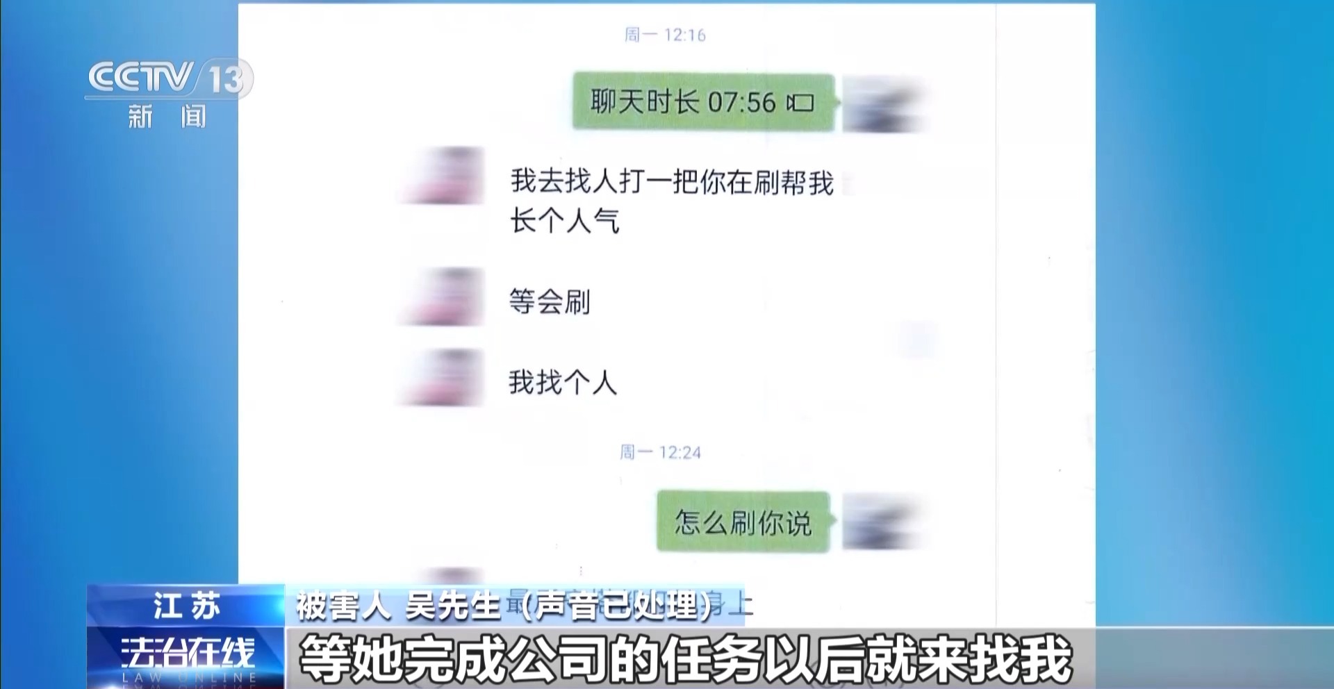 被害人 吴先生:她就一直跟我说,公司对他们的管理非常严格,自己欠公司钱,等她完成公司的任务以后就来找我。就想约她见面,不然的话就不给她刷礼物了,结果她立马就把我拉黑了。