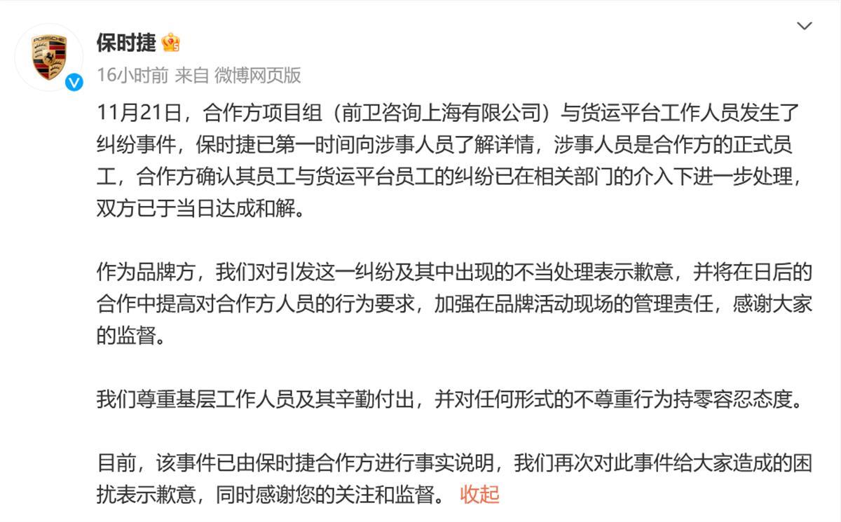 11月23日,因为600元搬运费用,上海一名货拉拉司机与保时捷相关工作人员的纠纷引发关注。保时捷方面公开致歉称,事发于11月21日,涉事的其中一方,是保时捷合作方项目组前卫咨询上海有限公司的正式员工,双方已于事发当日达成和解。作为品牌方,保时捷对引发这一纠纷及其中出现的不当处理表示歉意。