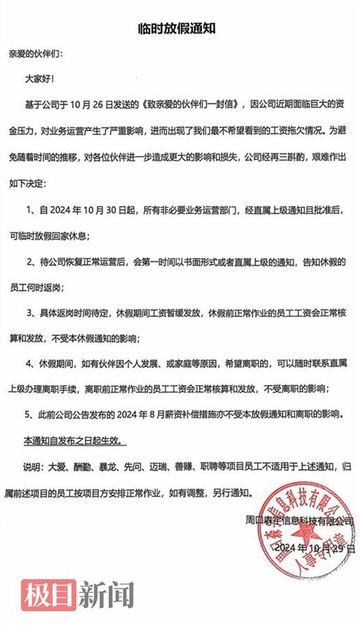 10月29日,林俊所在的企业微信群内发布了一则临时放假通知,通知称,因公司近期面临巨大的资金压力,对业务运营产生了严重影响,进而出现了工资拖欠的情况。为了避免对员工造成更大的影响和损失,自2024年10月30日起,所有非必要业务运营部门,可临时放假回家休息,待公司恢复正常运营后,根据相关通知进行返岗。