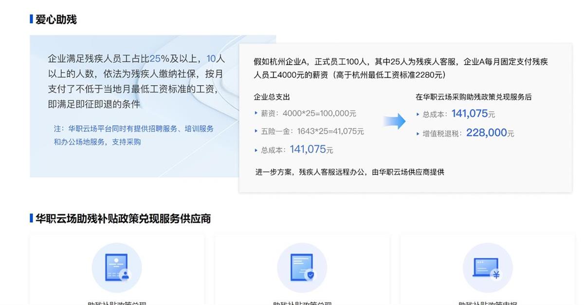 在华职云场科技有限公司的官网首页,明确写着“0元用工,残疾人外包用工补助”的广告词。其服务有“助残补贴政策兑现服务”,该页面还通过计算的方式,直观地显示企业安置一定数量的残疾人之后,能够获得国家退税的金额。