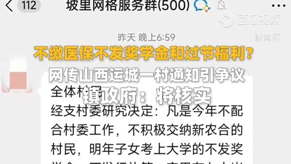 11月26日,有山西省运城市当地网友在社交平台发布一张聊天截图,称该市新绛县龙兴镇坡里村要求村民缴纳医保,不缴纳的村民子女考上大学不发奖学金、家中有70岁以上的老人不发过节福利等,此事引发关注。26日,当地龙兴镇政府相关工作人员回应新黄河记者称,村民缴纳医保并非强制性要求,针对此事将予以核实。