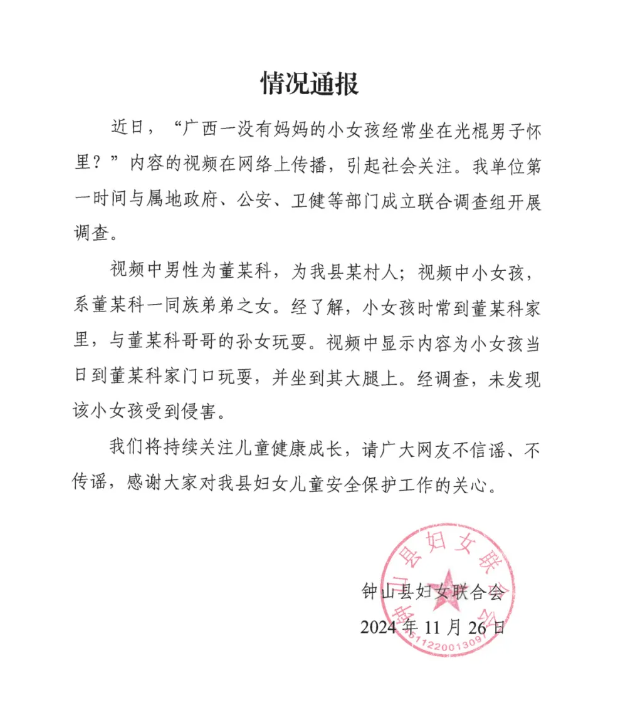 近日,“广西一没有妈妈的小女孩经常坐在光棍男子怀里?”内容的视频在网络上传播,引起社会关注。我单位第一时间与属地政府、公安、卫健等部门成立联合调查组开展调查。