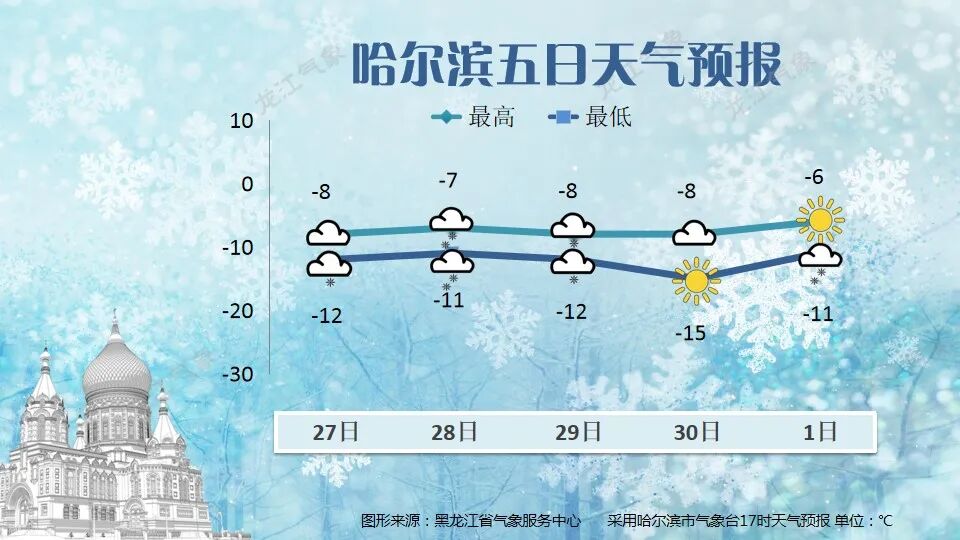 27日白天最高气温:大兴安岭、齐齐哈尔、鹤岗、佳木斯、鸡西-7~-5℃,黑河东部、伊春、七台河、牡丹江-3~-1℃,双鸭山0~2℃,其它地区-9~-7℃。