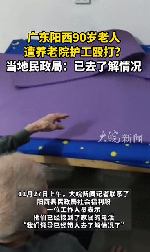 11月26日,有网民在社交平台发布视频称,自己90岁的爷爷在广东省阳江市阳西县一家养老院里被护工长期殴打。视频中,一位瘦弱的老人额头、眼眶、手臂都有较明显的淤青。