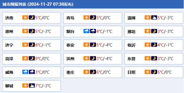 山东省气象台预计,今天,烟台北部和威海北部天气阴有小到中雪局部大雪,其他地区晴间多云。同时,滨州、东营、潍坊、日照、半岛地区和内陆湖面有北风6至7级,阵风8至9级,风力会逐渐减弱。此外,今天山东大部的最高气温将在低点继续下潜,多地仍会降温2℃左右,聊城和鲁南地区最高气温6℃左右,鲁中山区和半岛内陆地区1℃左右,其他地区3℃左右,城市中,济南今天最高气温5℃,创下半年最高气温新低。